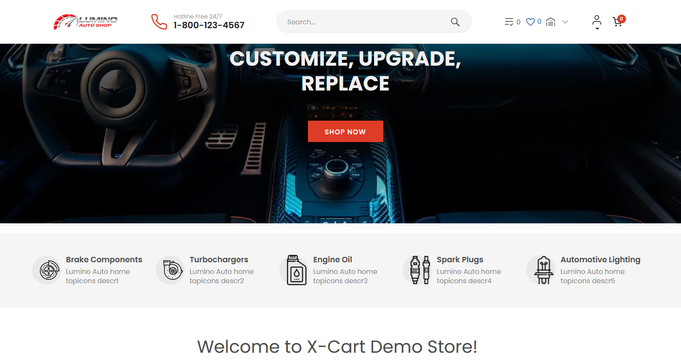 Lumino Auto is built for X-Cart and is designed to work seamlessly with the standard features of your store. It is particularly suitable for merchants who want a professional X-Cart car parts website theme that works well with structured catalogues and fitment-based product discovery.
