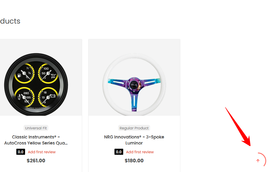 Lumino Auto includes an enhanced back-to-top feature with a circular progress indicator. This improves usability on longer pages by giving customers an easy way to return to the top while also providing a subtle visual cue showing how far they have scrolled.